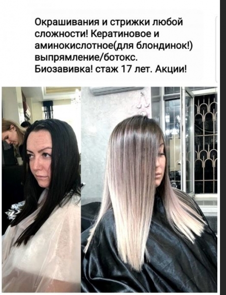 Предлагаю услуги по кератиновому и аминокислотному (для блондинок!) выпрямлению и ботоксу для волос! Так же стрижки и окрашивания любой сложности. Готов рассмотреть сотрудничество с мастерами и салонами красоты, парикмахерскими.