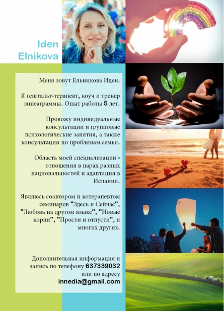 Провожу индивидуальные консультации и групповые психологические занятия, а также консультации по проблемам семьи в городах Испании Альмерия и Барселона. А так же веду консультации в Skype, для других городов.