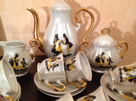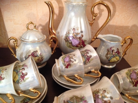 Это эксклюзивный сервиз на 12 персон, он считается антикварным. Сервиз называется "Свидание". Золотое покрытие 24 карата. В употреблении не был.