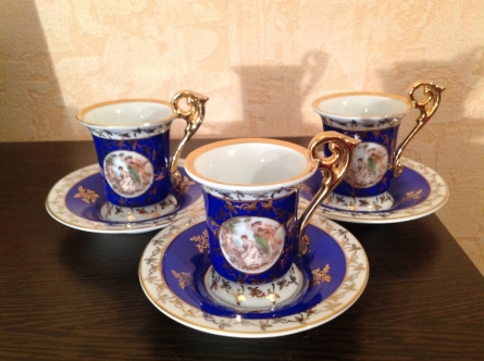 Три винтажные очень красивые чашки с блюдцами производство ГДР. Кобальт. Покрытие золотом 24 карата. 1949 года.