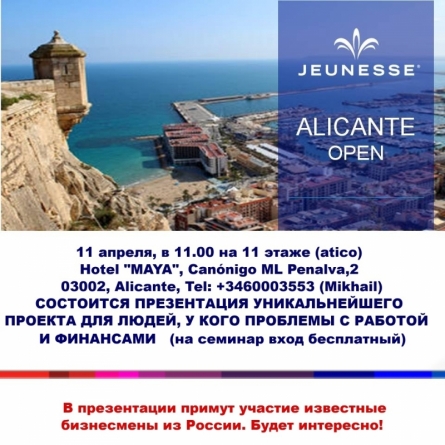Дорогие, Друзья! Завтра, 11 апреля, в Аликанте в 11.00 утра, в отеле "Майя", на 11 этаже (атико) состоится уникальный семинар для людей, у которых проблема с работой и финансовыми затруднениями! Мы вас познакомим с уникальным, легальным, и абсолютно надежным инструментом, чтобы...