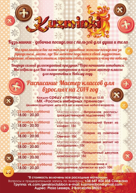 Добро пожаловать в женский клуб "Кuzminki", место, где можно встретить новых подруг, отдохнуть и поучиться ценнейшим женским искусствам и ремеслам.