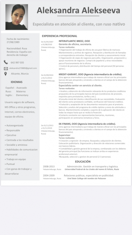 Ищу работу администратором, ресепшн, секретарь, менеджер по работе с клиентами, продавец и др. Проживаю в Аликанте, готова рассмотреть возможность переезда. Резюме прикреплено в фото.
