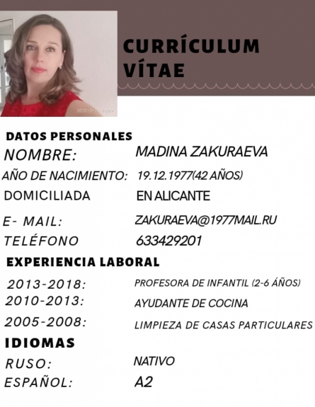 Здравствуйте, меня зовут Олеся, я украинка, серьезный и ответственный человек. Очень хочу работать и учиться. Мне 34 года, живу в Испании 3 года. У меня есть опыт работы помощником на кухне, горничной, официанткой, уборщицей. Пришло время подавать заявление на ВНЖ, необходим...
